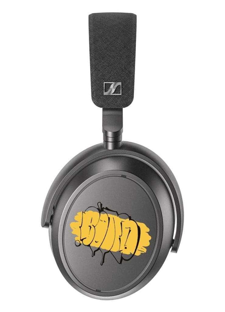 The left ear cup of the headphones features Bond Truluv’s signature ‘throwie’ tag, layered over a backdrop to evoke – wait for it – motion and depth. On the right ear cup, abstract linework apparently inspired by audio waveforms can be seen.