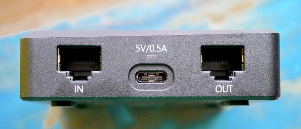 And yes, the Smoothlan Regenerator is small at just 105 x 80 x 23mm. Nicely packaged, it arrives with a 5V, external power supply designed to produce clean, stable power with multi-stage filtering. At the rear, the power socket sits in the centre, flanked by Ethernet input and output sockets.